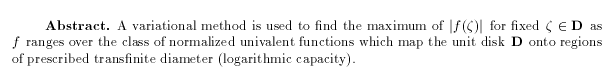 Cunningham, Robin: Univalent functions of given transfinite diameter: a maximum modulus problem, pp. 249-271.