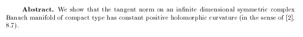 Mellon, Pauline: Holomorphic curvature of infinite dimensional symmetric complex Banach manifolds of compact type, pp. 299-306