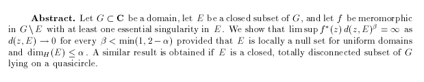 Järvi, Pentti: On the behavior of meromorphic functions around some nonisolated singularities II, pp. 373-378.