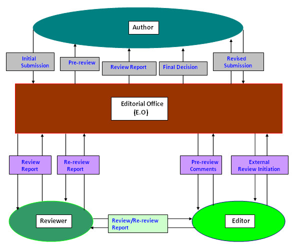 To initiate and complete rewiew and editorial processes, the possible types of communication are shown diagrammatically below involving Author, Editorial Office, Editor and Reviewer: