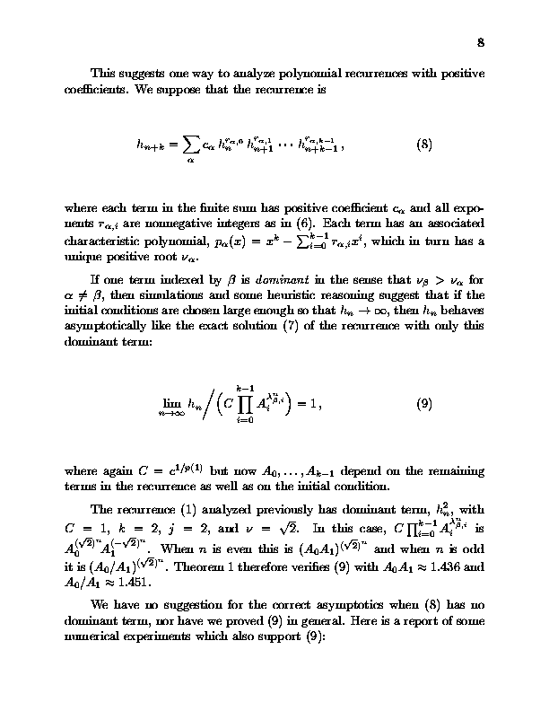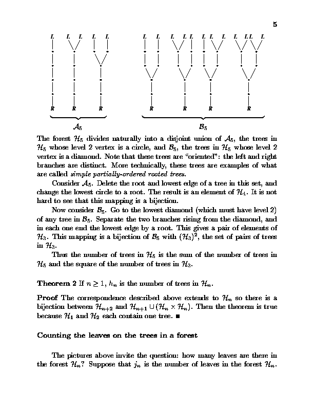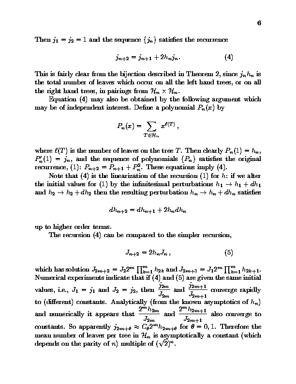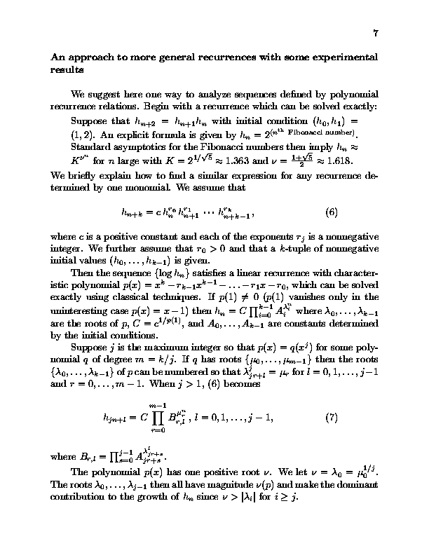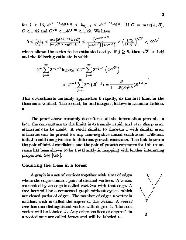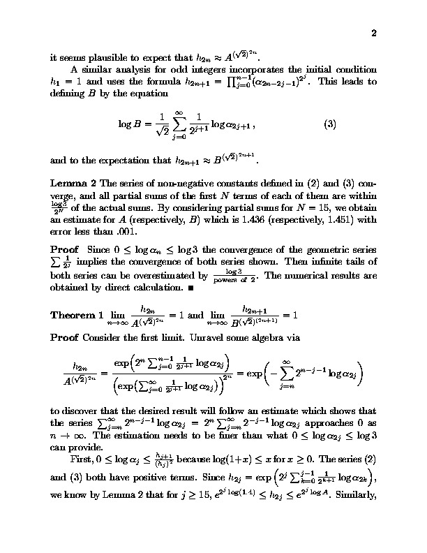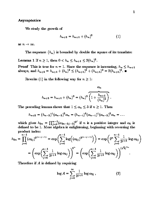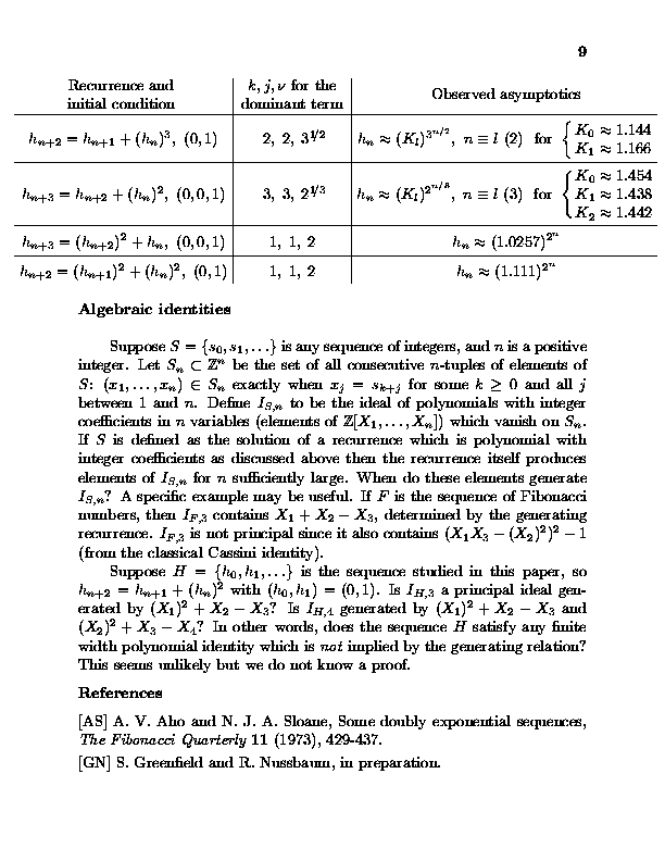 Abstract: The terms of A000278, the sequence defined by h0 = 0, h1 = 1, and hn+2 = hn+1 + hn2, count the trees in certain recursively defined forests. We show that for n large, hn is approximately Asqrt(2)n for n even and hn is approximately Bsqrt(2)n for n odd, with A,B > 1 and A not equal to B, and we give estimates of A and B: A is 1.436 ± .001 and B is 1.452 ± .001. The doubly exponential growth of the sequence is not surprising (see, for example, [AS]) but the dependence of the growth on the parity of the subscript is more interesting. Numerical and analytical investigation of similar sequences suggests a possible generalization of this result to a large class of such recursions.