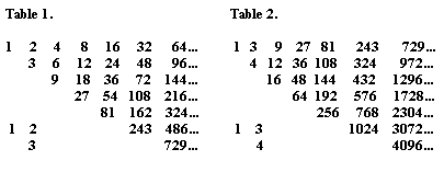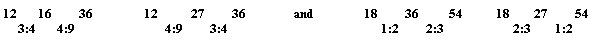 SEQUENCES ![]() Table 5 nicely reflects the three means that pervade mathematics, the geometric, arithmetic, and harmonic means. Given the sequence: a c b, the arithmetic mean is defined as: b-c = c-a or c = (a+b)/2 the harmonic mean is defined as : (b-c)/b = (c-a)/a or c = 2ab/(a+b). Notice in Table 5 that each element is the geometric mean of the elements to the left and right of it; an element of a given row is the arithmetic mean of the two elements that brace it from above; while a given element fits between the two numbers in the row below as the harmonic mean. What about the mean relations expressed by Table 6? Again each row is a geometric progression and again each element of a given row fits between the two numbers in the row above and below. However, an element of a given row is now a kind of generalized arithmetic mean defined by c=(a+b)/3 while a given element fits between two numbers in the row below it as a generalized harmonic mean c = 3ab/(a+b). These mean relations can be generalized to Table 3 where now the generalized arithmetic mean ca is defined as ca = (a+b)/x and the harmonic mean ch as ch=xab/(a+b). However, there is now an important restriction. In order for the means to lie between their respective pairs of numbers, x must satisfy the inequality x>f where f = (1+Ö5)/2, the golden mean. This result can be stated as a theorem (the proof is given in the Appendix). I will refer to this as Nicomachus's Theorem although Nicomachus was certainly not aware of the golden mean as we think of it today. NICOMACHUS'S THEOREM: For the elements in Table 2, we can define another table in which each element is the common (not generalized) arithmetic mean of the two elements above it while each element is the common harmonic mean of the two elements below it as shown in Table 7. ![]() A similar table for the geometric series based on 1:x can be created, although the table for x=2 is, of course, identical with the original and the table for x = f collapses into a single row with the other rows repetitions of this row. There is one noteworthy relation tying the common and generalized means for a given x together. Place the corresponding arithmetic and harmonic means, both common and generalized, between any pair of elements from Table 1 and 2, e.g., the sequence of common and generalized means between 6 and 12 for Table 1 and 12 and 36 for Table 2 are: The ratio of successive integers in this sequence are written below, and the product of these ratios equals 1/2 for the 1:2 sequence and 1/3 for the 1:3 sequence. In a similar manner, it can be shown that the product of the ratios for a 1:x sequence is 1/x. ALBERTI'S SYSTEM OF MUSICAL PROPORTIONS Table 5 was the basis of the system of musical proportions used by Leon Battista Alberti in Renaissance Italy [10],[11]. The ratio of numbers in the rows of Table 5 are in proportion 1:2 which represents the musical octave. Depressing the string of a monochord at its midpoint and sounding it with a bow yields a tone one octave above the fundamental tone characteristic of the whole string (see Figure 4). The integers on the left leaning diagonal are in the ratio 2:3 representing the musical fifth, i.e., if the fundamental is a C, the fifth is a G (five tones from C to G [CDEFG]), while the integers on the right leaning diagonal are in the ratio 3:4, a musical fourth, i.e., if the fundamental is C the fourth is an F (CDEF). The fifth and fourth correspond to bowed string lengths of 2/3 and 3/4 of the length of the fundamental as shown in Figure 4. Alberti's system of proportions was built upon the neo-Platonic ideas of the times in which the pair of geometric series framing the edges of Table 5 correspond to Plato's lambda figure alluded to in Timaeus and referred by Plato as the "world soul": ![]() A "hexagon" of numbers was chosen within Table 5 (that is, numbers chosen so that they appear to form the vertices of a hexagon, such as 8-16-24-18-9-6, with 12 in the middle) in which adjacent numbers represented the ratio of length, width, and heights of architectural spaces such as walls, ceilings, doors, etc. That this system of proportions exhibits harmony is illustrated by taking a pair of integers from a given row, e.g., 6 and 12 and interspersing it with its arithmetic and harmonic means. Notice that the arithmetic and harmonic means insure the repetition of the ratios 2:3 and 3:4 to which they correspond . Also 2/3 x 3/4 = ½, i.e., octave is obtained by summing the intervals of a fifth and a fourth. Similar harmonic relationships hold for Tables 6 and 7. For example, place the generalized arithmetic and harmonic means between 12 and 36 in Table 6 and the common arithmetic and harmonic means between 18 and 54 in Table 7.