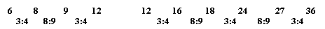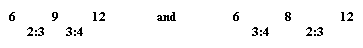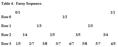and superpartients of other kinds are made to appear -- (*In order to represent fractions, Greek arithmetic employed a system in which ratios were referred to as : multiples, mn:n; superparticulars, as 1 + 1:n; superpartients, as 1 + k:n, k>1; multiple superparticulars, as m + 1:n, m>1; multiple superpartients, as m + k:n, both m and k being greater than 1.) He then goes on to cite another example: From 16, 28, 49 (ratio 4:7) comes either 16, 44, 121 (ratio 4:11) or 49,77,121 (ratio 7:11). Apart from the archaic language, this transformation appears to relate to the Farey sequence shown in Table 4. Farey sequences are, in turn, related to representations of rational numbers as continued fractions with applications to dynamical systems [3,4]. They also have applications to musical tuning systems [5,6]. The numerator (N) and denominator (D) of any rational number in the Farey sequence is gotten by adding the numerators and denominators of the two terms that brace it from the rows above it, e.g., 3/5 is braced by ½ and 2/3 so 3/5 = (1+2)/(2+3). In the Farey sequence each rational number x = N/D in one row gives rise to two rationals, 1: (1+x) = D/(N+D) and x:(1+x) = N/(N+D) in the next row, e.g., 2:5 ® 2:7 and 5:7. In this sense, Nicomachus indicates an early awareness of the concepts underlying the Farey sequence which has become an important tool of modern mathematics and music.