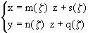 E(M) This guideline for arranging the ellipses will be called the 'Arrangement Law' and shall correspond to a "generating line" upon which all transformed points coming from a single point of the generator ellipse shall rest. This means that each k applied to the generator ellipse will have its corresponding point upon the generating line in space. That is to say, each k applied to the generator ellipse will have its corresponding ellipse in space, which is an aditional arrangement condition for all parallel planes . Each point belonging to the generator conic creates lines of the same family according to the 'Arrangement Law'. So, if this 'Arrangement Law' is a linear function of or proportional to the generating factor k, those lines shall be straight lines belonging to a ruled surface. It is especially important to mention here in reference to matters of construction that those points belonging to the generating lines can be defined at once, by simply linking the homologous points between a straight line segment and a circumference. Thus a whole set of ellipses are obtained without the need to resort to traditional means for their generation. The simplicity of this mathematical treatment deserves to be noted as a remarkable property, in comparison to the fact that usually the only simple treatment of similar ruled surfaces in science and technology is a graphic one. It is outstanding that, thanks to the 'Arrangement Law', an infinity of surfaces,whether be linear or not, can be settled up. Substituting k for z in equation (6) according to the linear relation k=cz, for c = 1, we have: