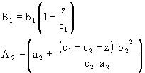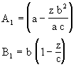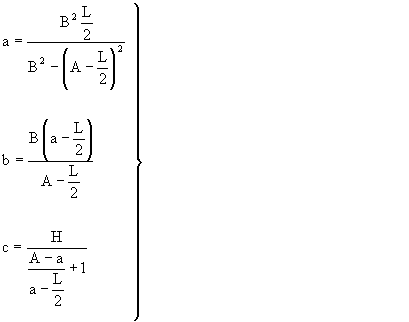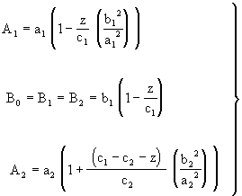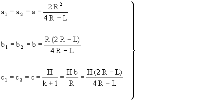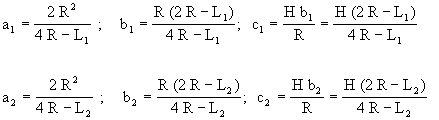 where the values a1, b1, c1 and a2, b2, c2, for the elemental surfaces 1 and 2 respectively, are given by the following expressions obtained from (23) by simply making A=B=R and identifying L by L1 and L2 depending on the elemental surface to which it refers.