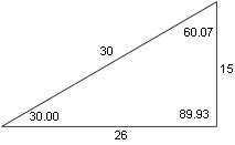 Again, the Villa Rotonda provides an example. Mitrovic observes that the height of each of the four corner rooms is given by the arithmetic mean, (26 + 15) / 2 = 20.5, so that each has a height to width ratio of approximately 1.3666. Moreover, the adjacent four rooms (the only other primary rooms on the piano nobile other than the central domed room; see Fig. 7), each of which measure 15 by 11, not only share a dimension with the corner rooms but are of proportion approximately 1.3636, which is within 0.2% of 1.3666. There is another crucial link between rooms that Mitrovic fails to observe, however: the diameter of the central domed room is 30, which is the hypotenuse of a (virtual) 30°-60°-90° triangle having 26 and 15 as its two legs (Fig. 8)!