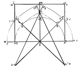 The same custom seems to have existed in the Arab world. It is also useful to know, more or less, how much material is needed like gold for gilding, bricks for construction or paint and such things. Payment per cubit was common in Ottoman architectural practice where a team of architects and surveyors had to make cost estimates of projected buildings and supply preliminary drawings for various options. In addition to facilitating estimates of wages and building materials before construction, al-Kashi's formulas may also have been used in appraising the price of a building after its completion. His sophisticated formulas were, like the simple formulas found in the Arithmetic Books, useful for everyday life. This was al-Kashi's objective for writing his Key of Arithmetic. ILLUSTRATION: Construction of the second type of arch, three-centered, from al-Kashi's Key to Arithmetic. ABOUT