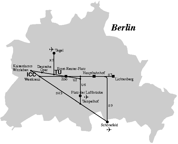 All airports and train stations are well connected to all main locations in Berlin by public transport -- Berlin is well served by a far reaching network of bus, U-Bahn (subway) and S-Bahn (inner city railway) lines. The standard fare for a single ride AB-ticket that is valid on all busses, subways etc. will be DM 3.90. You will need this only on your day of arrival, since with the congress registration materials you will receive your Local Transportation Ticket.