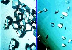 Og i det små handler det for eksempel om at forstå hvordan og hvorfor geometrien og dermed egenskaberne af insulinkrystaller er så meget bedre når de dyrkes "vægtløst", som vist her til venstre, i forhold til når
