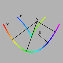The curve X(t) = (t, t2) and its evolute E, with normals to points A inside the cusp of E and B outside the cusp of E.