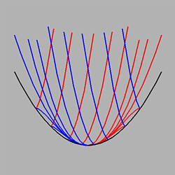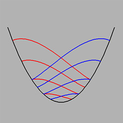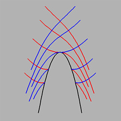 So there are 0, 1, or 2 asymptotic directions, according as the discriminant (fxy)2 - fxxfyy is negative, zero, or positive. The discriminant and the Gaussian curvature have opposite signs, so there are no asymptotic directions at an elliptic point, one at a parabolic point, and two at a hyperbolic point. The asymptotic direction at a parabolic point is the zero principal curvature direction, which is tangent to the parabolic curve at a Gaussian cusp. (Cf. (a) above).