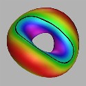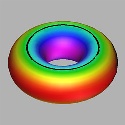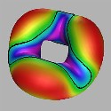 Click on a picture to view an mpeg picture of the surface rotating. Click on the arrow to view an mepg of the warping of the torus of revolution.