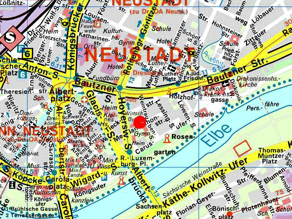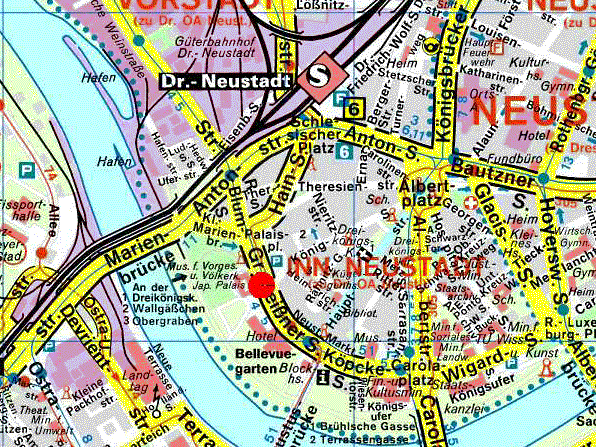 Leave the Highway A 4 at Dresden - Neustadt, follow Lommatzscher Strasse and Leipziger Strasse to the inner part of Dresden. The Grosse Meissner Strasse is the immediate continuation of Leipziger Strasse.