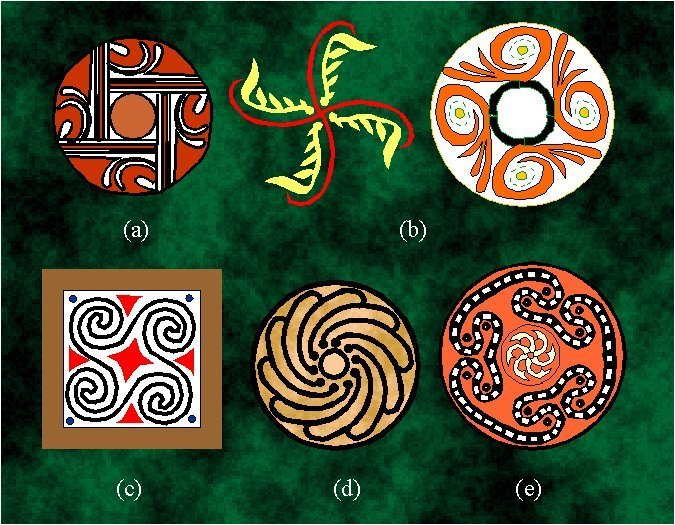Examples of rosettes of the type Cn (n) and Dn (nm) in European ancient art: (a) C4 (4), Neolithic, Rumania; (b) C4 (4), Knossos, Crete, around 2500 B.C.; (c) C10 (10), Mycenae; (d) C4 (4), Crete; (e) D3 (3m), Mycenae. |