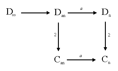 A survey on the symmetry groups of rosettes and the group-subgroup relations can serve as a basis for the construction of rosettes by the desymmetrization method. These relations are schematically shown in Figure 2.26, where an arrow designates the group-subgroup relation, and an attached symbol the index of the subgroup in the group. These relations determine the possibilities available to the classical-symmetry, antisymmetry (for subgroups of the index 2) and color-symmetry desymmetrizations or their combinations, aiming to obtain rosettes of a lower degree of symmetry.