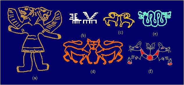 Examples of the symmetry group D1 (m): (a) the two-headed winged lion (Tell Hallaf, about 5000 B.C.); (b) formation of motifs with the symmetry D1 (m) (cave paintings, La Pileta, Spain); (c) art of the pre-dynastic period of Egypt; (d) motif from the Ionian amphora; (e) two-headed Mayans snake; (f) primitive art of the American Indians. |