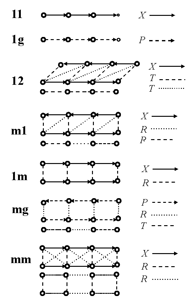 To denote them, we have used the simplified version of International Two-dimensional Symbols (M. Senechal, 1975; H.S.M. Coxeter, 1985). Here, the first symbol represents an element of symmetry perpendicular to the direction of the translation, while the second denotes an element of symmetry parallel or perpendicular (exclusively for 2-rotations) to the direction of the translation.