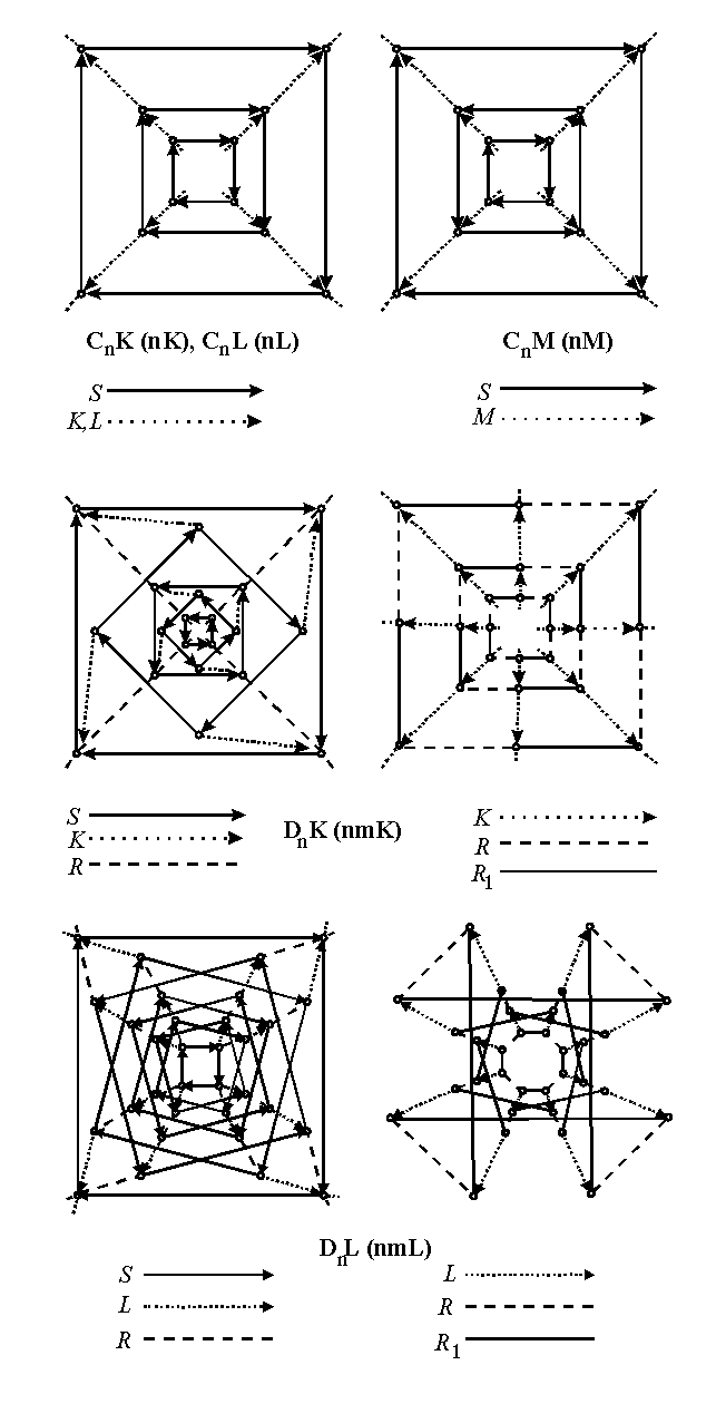 The next step in the development of the theory of similarity symmetry in the plane E2 was a contribution by A.V. Shubnikov (1960). He described all the similarity transformations of the plane E2: central dilatation K, dilative rotation L and dilative reflection M and the symmetry groups derived by one of the transformations mentioned and by isometries having the same invariant point - rotations and reflections. Shubnikov derived six types of discrete similarity symmetry groups of rosettes S20: CnK, CnL, CnM, DnK, DnL, DnM, denoted by Shubnikov nK, nL, nM, nmK, nmL, nmM respectively. Since the types DnM (nmM) and DnL (nmL) coincide, there are, in fact, five types of the discrete similarity symmetry groups of rosettes S20: CnK (nK), CnM (nM), CnL (nL), DnK ( nmK), Dn L (nmL) and two types of the visually presentable continuous similarity symmetry groups of rosettes S20: D¥ K (¥K) and CnL1 (nL1). The term "type of similarity symmetry groups of rosettes" and the corresponding type symbol denote all the similarity symmetry groups defined by this symbol, that can be obtained by different combinations of parameters defining them. For example, by the symbol CnK (nK) are denoted all the corresponding similarity symmetry groups which can be obtained for different values of n (n Î N) and k (where K = K(k)).