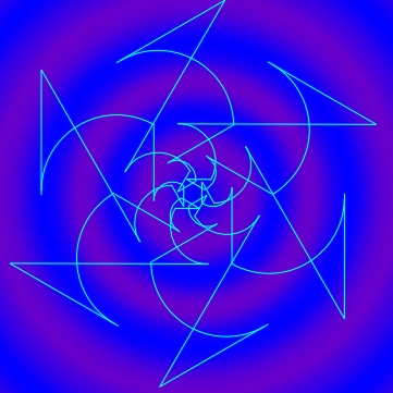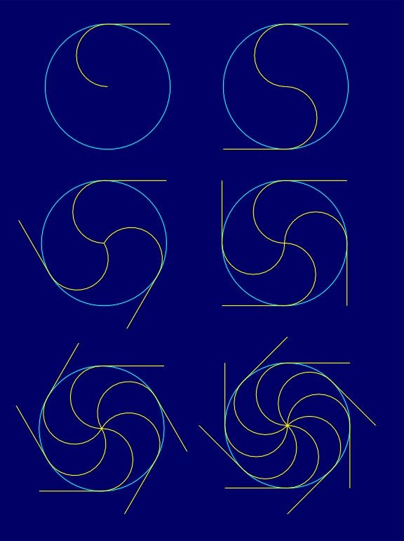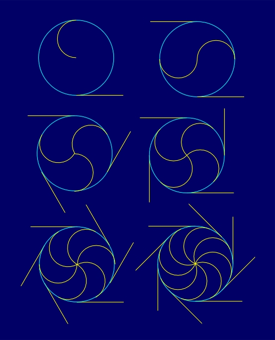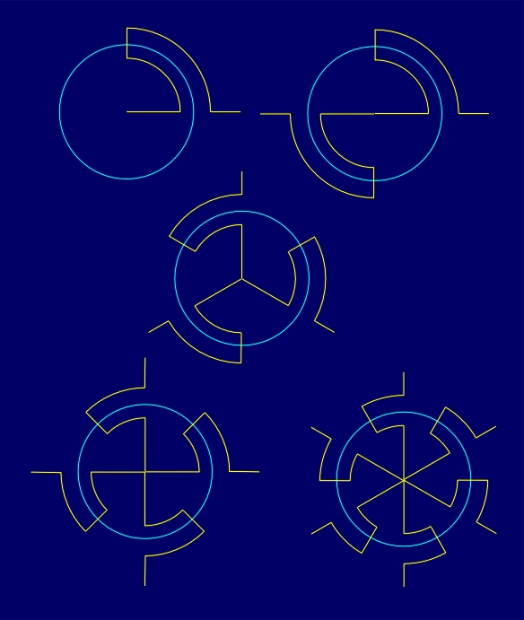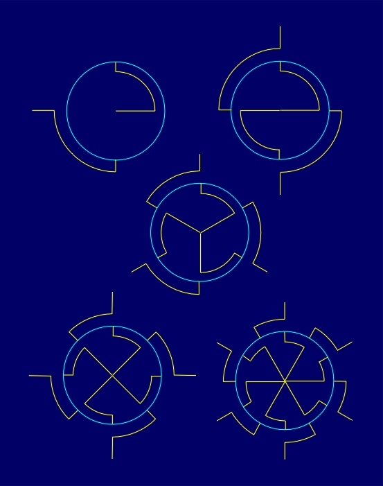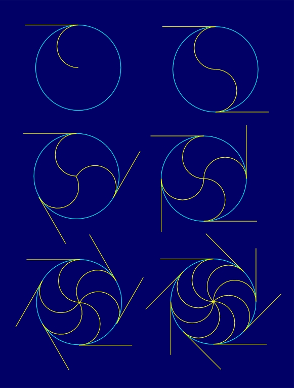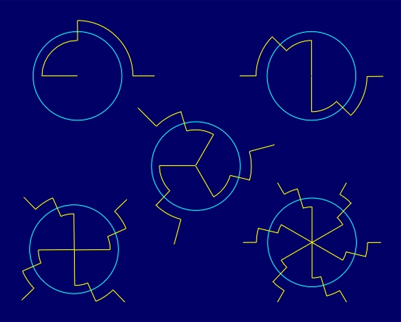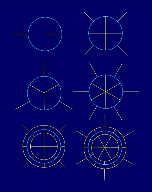 The variety of conformal symmetry rosettes with the symmetry group D1NI can be accomplished by the choice of the form of non-reflectional boundaries of a fundamental region or by using different elementary asymmetric figures belonging to a fundamental region. In that way, a large spectrum of the possible degree of visual dynamism can be achieved (Figure 4.12). It goes from static conformal symmetry rosettes with the symmetry group D1NI, without the application of an elementary asymmetric figure within a fundamental region, to conformal symmetry rosettes of a higher degree of visual dynamism, which can be, for instance, formed by circle and line segments alternating along a radial line.