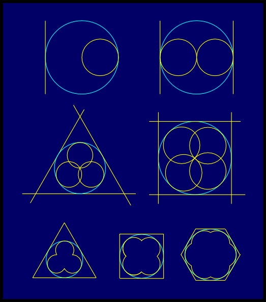 Conformal symmetry rosettes with the symmetry group KD1NI (Figure 4.16) can be constructed multiplying by the dilatation K (with k > 0) a conformal symmetry rosette with the symmetry group D1NI, belonging to a fundamental region of the symmetry group K. A fundamental region of the group KD1NI is the section of fundamental regions of the groups K and D1NI, and it allows a varying of non-reflectional boundaries.
