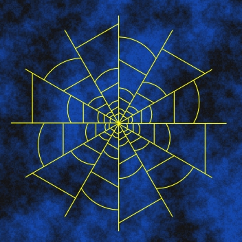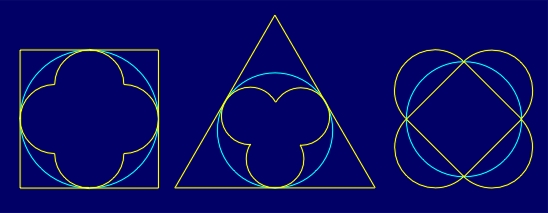 Conformal symmetry rosettes with the symmetry group KNI (Figure 4.14) can be constructed multiplying by the dilatation K (with k > 0) a conformal symmetry rosette with the symmetry group NI, belonging to a fundamental region of the group K. A fundamental region of the group KNI is the section of fundamental regions of the groups K and NI, and it allows a varying of the form of all the boundaries. Since the dilatation K is the element of every group of the type KNI, to efficiently construct the corresponding visual interpretations one applies two inversions in the concentric inversion circles. All the visual properties of a generating conformal symmetry rosette with the symmetry group NI, after the introduction of the dilatation K, are maintained in the derived conformal symmetry rosette with the symmetry group KNI. The dilatation K stimulates their visual dynamism, producing the suggestion of centrifugal expansion. Owing to their low degree of symmetry and to their visual properties mentioned, the corresponding conformal symmetry rosettes are very rare in ornamental art. Those examples that exist in ornamental art, in the first place respect the principle of visual entropy.