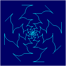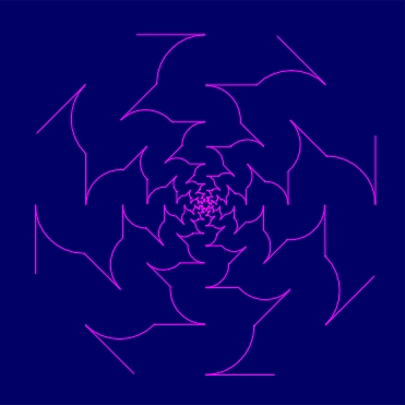 The type LCnZI consists of conformal symmetry groups that are the result of the superposition of the groups L and CnZI. Visual examples of conformal symmetry groups of the type LCnZI can be constructed multiplying by the dilative rotation L (with k > 0) a conformal symmetry rosette with the symmetry group CnZI, belonging to a fundamental region of the group L (Figure 4.18). The visual effect of the dilative rotation L is the appearance of a dynamic spiral-motion component. For a rational angle q of the dilative rotation L, q = pp/q, (p,q) = 1, p,q Î Z, it is possible to divide a conformal symmetry rosette with the symmetry group LCnZI into sectors of the dilatation K((-1)pkq). A fundamental region of the group LCnZI is the section of fundamental regions of the groups L and CnZI. Hence, a varying of the shape of all the boundaries of a fundamental region is allowed. Since the dilative rotation L is a composite transformation, the relationship L = KS = SK holds, where a rotation with the rotation angle q is denoted by S. Conformal symmetry rosettes with the symmetry group KCnZI can be constructed by using a generating conformal symmetry rosette with the symmetry group CnZI, but such a construction is, in a certain degree, complicated. The conformal rosette mentioned, must be first transformed by an inversion with the inversion circle mI concentric to this rosette. After that, the image obtained must be transformed by the reflection R with the reflection line containing the singular point O, and finally, by the rotation S.