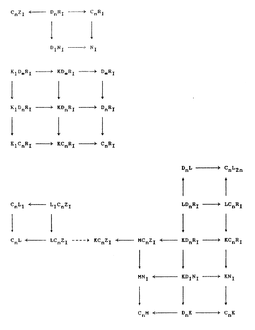 For a derivation of groups of the type KNI, desymmetrizations of groups of the type KC2nRI, somewhat more frequent in ornamental art, are also used. Besides the classical-symmetry desymmetrizations, the antisymmetry desymmetrizations resulting in the conformal antisymmetry groups of the type KC2nRI/KNI, discussed in the classical theory of symmetry within the type KNI, are frequent.