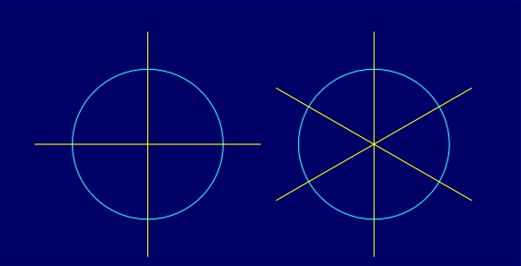 Owing to maximal constructional simplicity, groups of the type DnRI have a special role in ornamental art. Very interesting visual interpretations of these groups are obtained, reproducing by the inversion RI a rosette with the symmetry group Dn (nm), constructed by circles (or their arcs) containing the singular point O and touching the inversion circle mI. The inversion RI transforms these circles (arcs) onto the tangent lines (parts of tangent lines) of the inversion circle in the touch points (Figure 4.6, 4.7). These conformal symmetry rosettes are used in ornamental art by almost all cultures. They have a special place in Romanesque and Gothic art, within rosettes used in architecture.