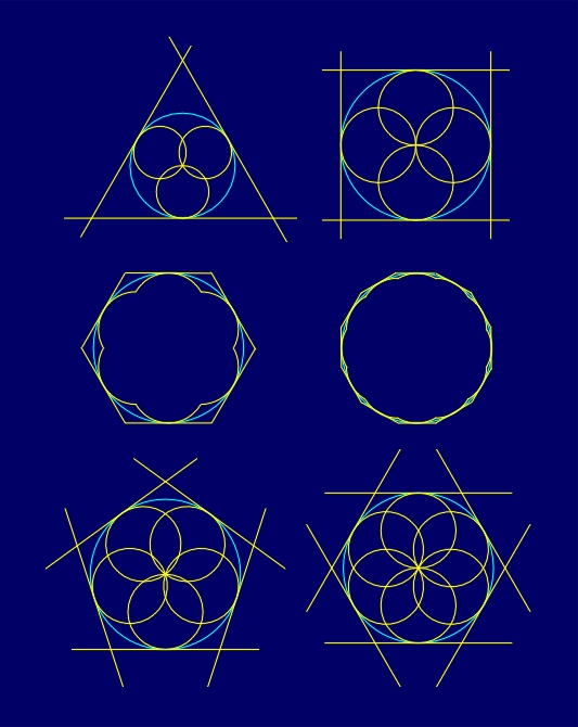 Every conformal symmetry group of the type CnRI is the direct product of the symmetry groups Cn (n) and RI. Hence, visual interpretations of conformal symmetry groups of the type CnRI (Figure 4.3, 4.4) can be constructed multiplying by the inversion RI a rosette with the symmetry group Cn (n), belonging to a fundamental region of the group RI, or multiplying by the n-fold rotation a figure with the symmetry group RI, belonging to the fundamental region of the group Cn (n). A fundamental region of the group CnRI is the section of the fundamental regions of the groups Cn (n) and RI. Owing to the presence of the indirect symmetry transformation - inversion RI - in groups of the type CnRI enantiomorphic modifications do not occur. The visual effect and degree of visual dynamism in rosettes with the conformal symmetry group CnRI depend exclusively on the choice of the form of a fundamental region, or on the position and form of an elementary asymmetric figure within a fundamental region. A degree of visual dynamism goes from conformal symmetry rosettes alike to rosettes with the symmetry group Cn (n) (Figure 4.3), to the conformal symmetry rosettes with a fully expressed stationary visual component resulting from the visual effect of the inversion RI, similar to the visual effect of a reflection. Those "static" conformal symmetry rosettes with the group CnRI can be constructed by using an asymmetric figure, with its shape very close to the inversion circle, or by using a fundamental region of a similar form (Figure 4.4). A fundamental region of the group CnRI offers a change of non-inversional boundaries, i.e. boundaries that do not belong to the inversion circle mI. This is the only restriction to the choice of a fundamental region, since the invariance of all the points of the inversion circle must be preserved.
